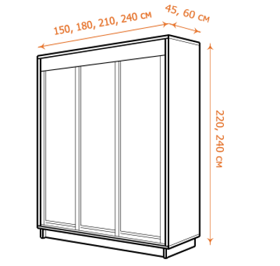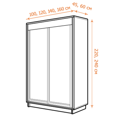 Мы выпускаем серийные шкафы-купе, но вы можете выбрать подходящие для вашего интерьера варианты ширины, высоты и глубины. Для отдельно стоящих шкафов-купе Е1 есть 24 варианта размеров, которые подбираются по комбинациям высоты, глубины и ширины.